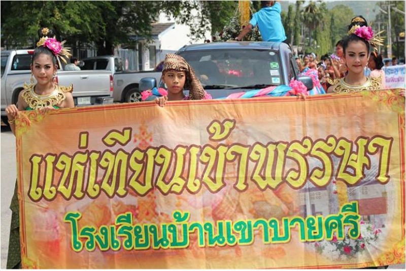 โรงเรียนบ้านเขาบายศรีจัดกิจกรรมแห่เทียนพรรษาและถวาย เพื่อสืบสานวัฒนธรรมประเพณีท้องถิ่นที่ดีงาม เป็นพุทธบูชา ธรรมบูชา สังฆบูชา  แห่เทียนพรรษา ณ ตลาดชุมชน กม. 10 และถวายเทียนพรรษาวัดเขาบายศรี วันที่ 15 กรกฎาคม 2559 (ภาพ/ข่าวประชาสัมพันธ์โรงเรียน)