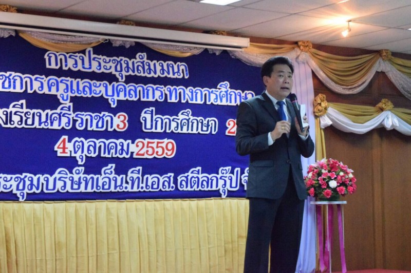 เมื่อวันที่ 4 เดือนตุลาคม 2559 เวลา 08.30 น. ที่ห้องประชุมบริษัทเอ็น.ที.เอส.สตีลกรุ๊ป จำกัด : นายวิชัย พวงภาคีศิริ ผู้อำนวยการสำนักงานเขตพื้นที่การศึกษาประถมศึกษาชลบุรี เขต 3 เป็นประธานเปิดการประชุมพัฒนาศักยภาพข้าราชการครูและบุคลากรทางการศึกษา กลุ่มโรงเรียนศรีราชา 3 ประกอบด้วยโรงเรียนบ้านบ่อวิน โรงเรียนบ้านบึง โรงเรียนบ้านหนองปรือ โรงเรียนวัดอัมพวัน โรงเรียนบ้านเขาตะแบก โรงเรียนวัดจุกกะเฌอ และโรงเรียนบ้านวังค้อ จำนวนทั้งสิ้น 178 คน เพื่อพัฒนาทักษะวิชาชีพ และสานสัมพันธ์ระหว่างบุคลากรทุกคนในกลุ่มโรงเรียน (ภาพ : เครือข่าย ปชส.โรงเรียนบ้านบ่อวิน/ปิ่นเพชร แช่มช้อย : ข่าว)