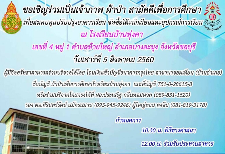 ที่จะจัดขึ้นในวันที่  5 สิงหาคม 2560 เพื่อสมสบทุนปรับปรุงอาคารเรียน จัดซื้อโต๊ะนักเรียนและ