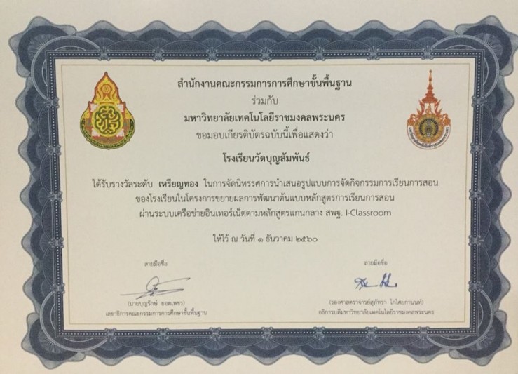 วันที่ 30 พฤศจิกายน - 2 ธันวาคม 2560 โรงเรียนวัดบุญสัมพันธ์ เข้าร่วมจัดนิทรรศการ นำเสนอรูปแบบการจัดกิจกรรมการเรียนการสอนของโรงเรียนในโครงการขยายผลการพัฒนา ต้นแบบหลักสูตรการเรียนการสอนผ่านระบบเครือข่ายอินเทอร์เน็ตตามหลักสูตรแกนกลาง สพฐ. I-Classroom และได้รับรางวัลระดับเหรียญทองในการจัดนิทรรศการ ณ ชลพฤกษ์รีสอร์ท จ. นครนายก