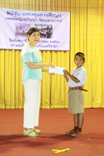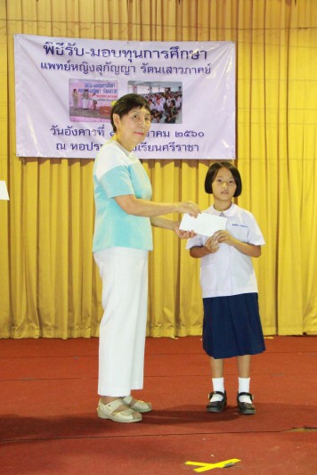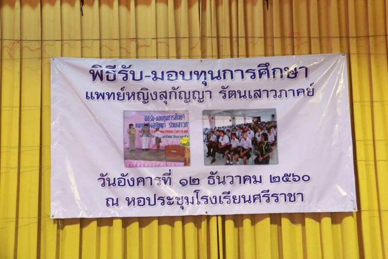 พิธีมอบทุนการศึกษา "แพทย์หญิงสุกัญญา รัตนเสาวภาคย์" เพื่อนักเรียนยากจนและขาดแคลนทุนทรัพย์ ในเขตพื้นที่อำเภอศรีราชา วันอังคารที่ ๑๒ ธันวาคม ๒๕๖๐ ณ ห้องประชุมโรงเรียนศรีราชา (พิมลดา จินตนา : ภาพ/ข่าว)